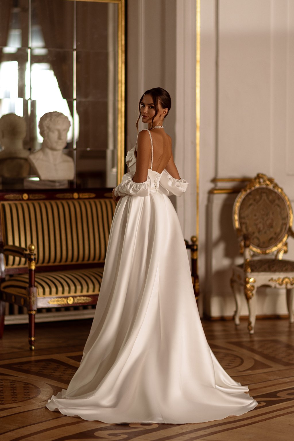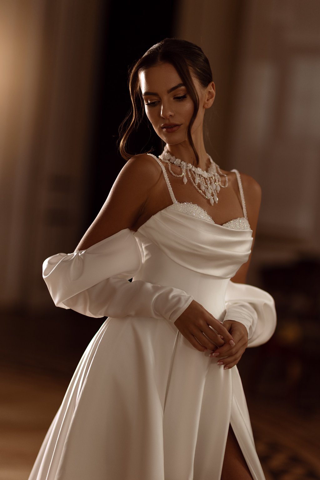Nadčasové svadobné šaty EMPIRE 24 z hladkého saténu budú pre Vás ako stvorené.Tento výnimočný model na ramienka je nadčasovým kúskom. Ich krásu zvýrazní ručne šité zdobenie korálikmi a jemné riasenie. Hlboký výstrih na chrbte a rázporok zaujme svojom zmyselnosťou. Odnímateľnými rukávmi si viete rýchlo zmeniť vzhľad šiat. Priliehavý zvršok a jemne riasená sukňa je takto dokonalou kombináciou.