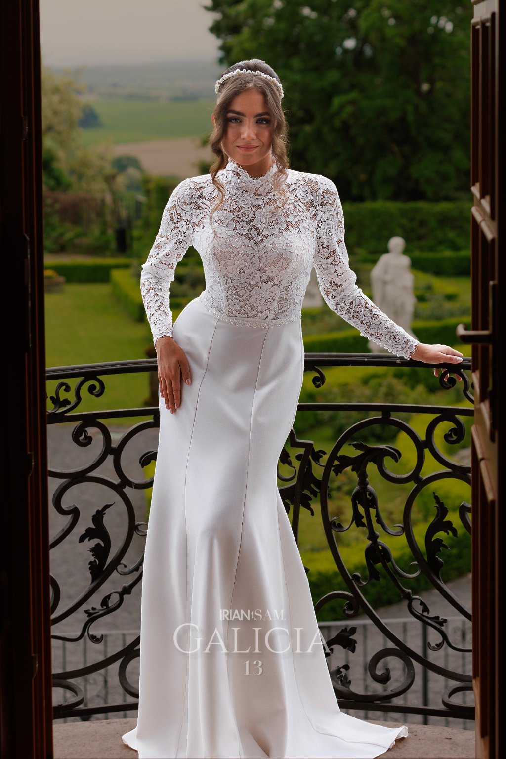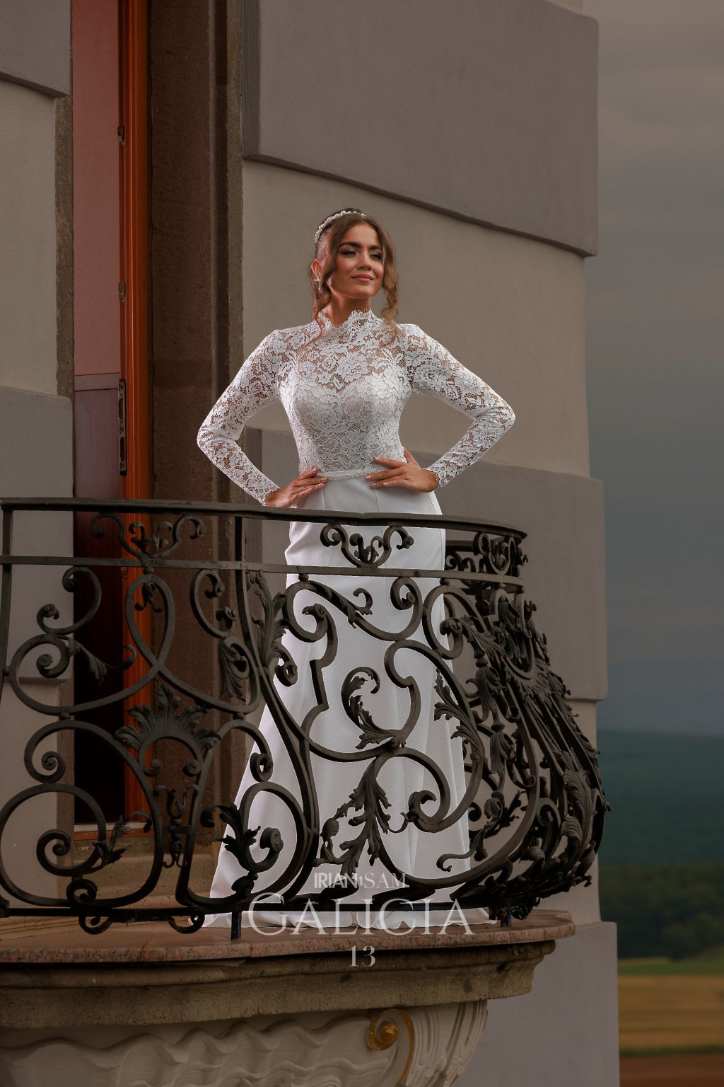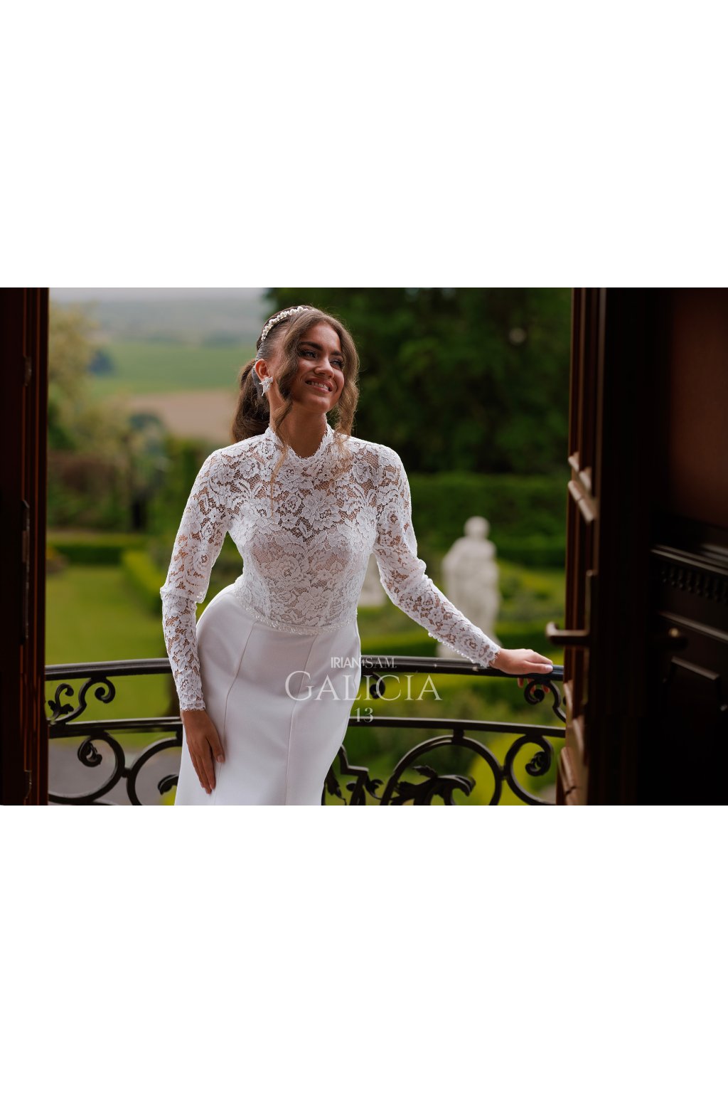 Dokonale pôvabné svadobné šaty úzkeho strihu s očarujúcou zdobenou čipkou siahajúcou až ku krku. Ak hľadáte kombináciu hladkej sukne a zdobeného zvršku, tento model spĺňa obidve kritéria. Dlhé rukávy vás zahalia, ale zároveň sú vzdušné a jemné na dotyk. Chrbát je ozdobený zapínaním na gombíky a decentným výstrihom.