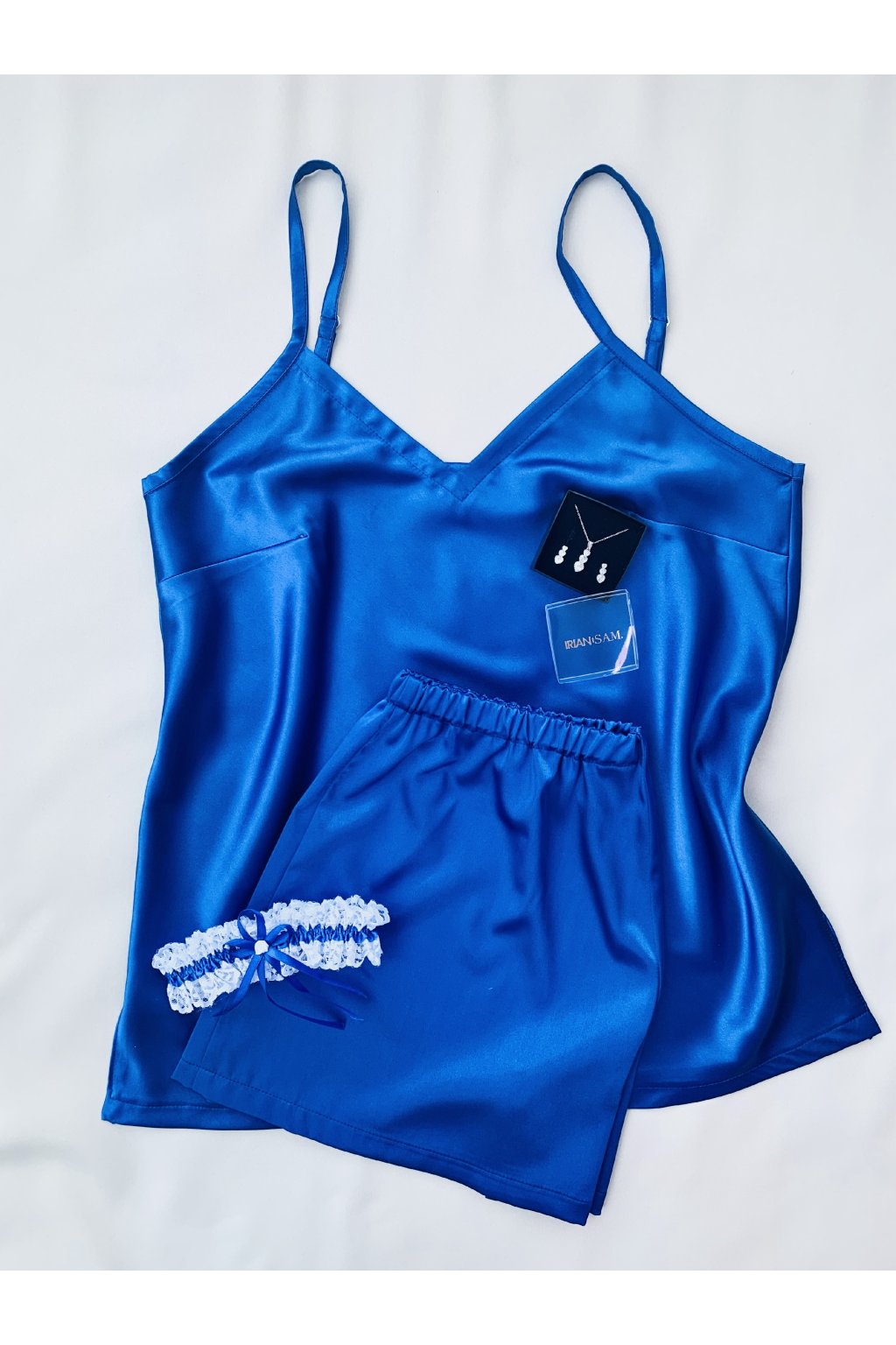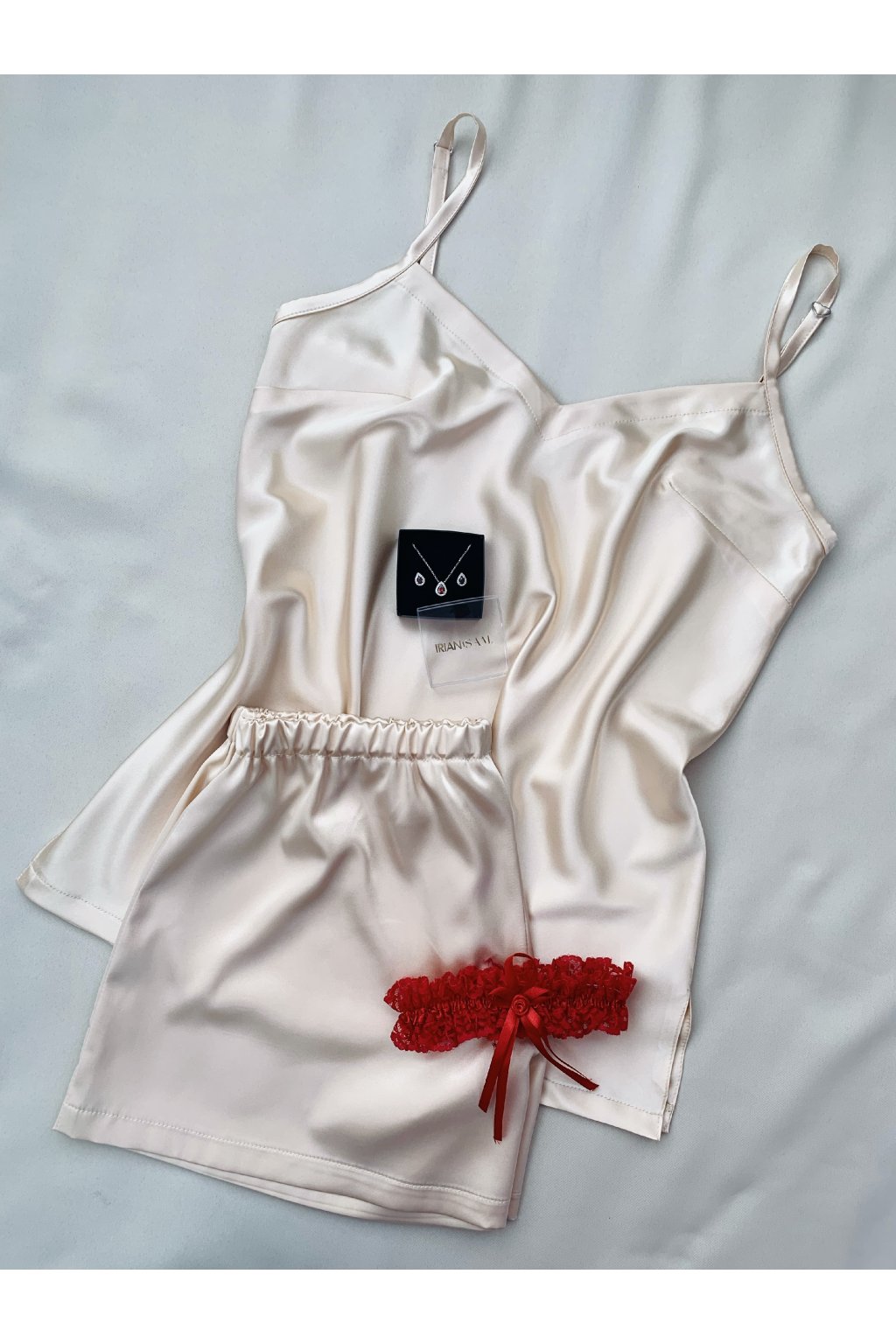 Dvojdielne saténové pyžamko s tenkými nastaviteľnými ramienkami. Spodný diel má v páse elastickú gumičku, ktorá sa pekne prispôsobí obvodu pásu.