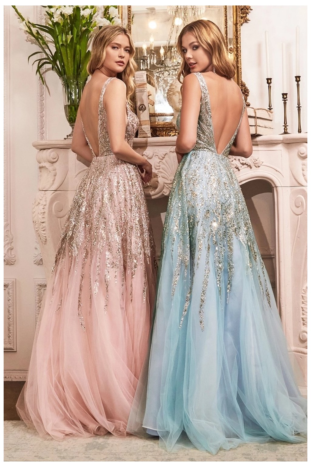 Pôvabné spoločenské šaty s hlbokým výstrihom, bohatým trblietavým zdobením a jemne rozšírenou sukňou. Kombinácia svetlých pastelových odtieňov a ligotavých detailov vytvára luxusný a rozprávkový vzhľad.