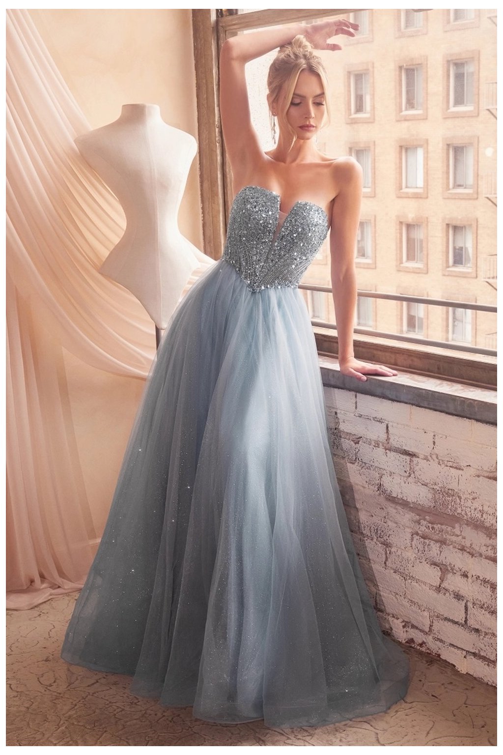 Romantické večerné šaty s bohato zdobeným korzetovým živôtikom a jemne rozšírenou princeznovskou sukňou. Hlboký srdiečkový výstrih dodáva modelu ženskosť, zatiaľ čo trblietavé detaily vytvárajú luxusný, éterický vzhľad.