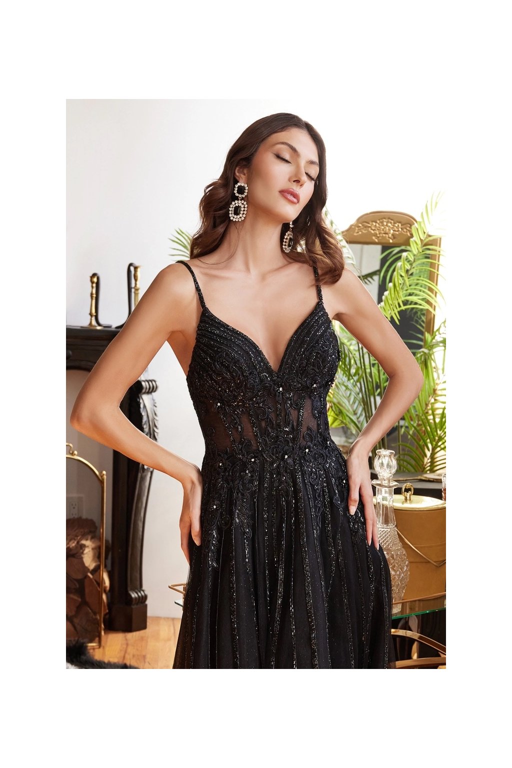 Tieto čierne večerné šaty upútajú zvodným výstrihom, prepracovanou výšivkou a trblietavými detailmi, ktoré nádherne formujú postavu. Pôsobia elegantne, dramaticky a sú ideálnou voľbou pre ženu, ktorá chce zažiariť pri každom kroku.