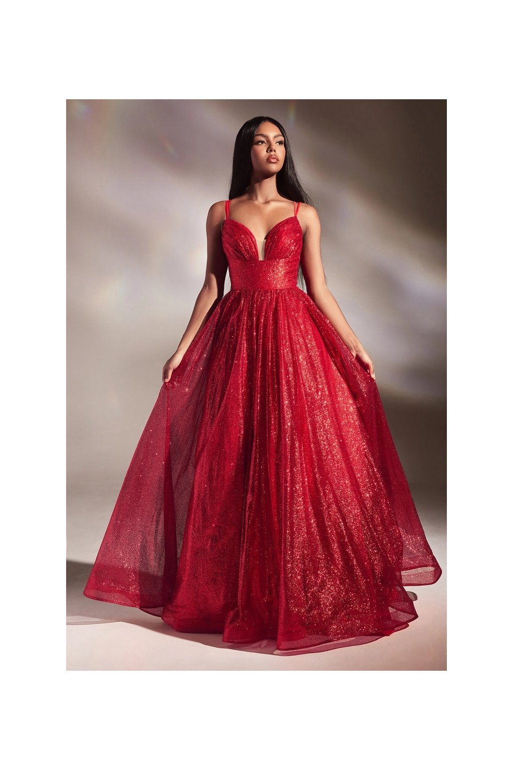 Oslnivé červené šaty vytvárajú výrazný a sebavedomý vzhľad. Zvýraznený živôtik, jemné ramienka a bohatá splývavá sukňa pôsobia mimoriadne žensky, pričom celkový efekt ešte umocňuje trblietavý lesk.