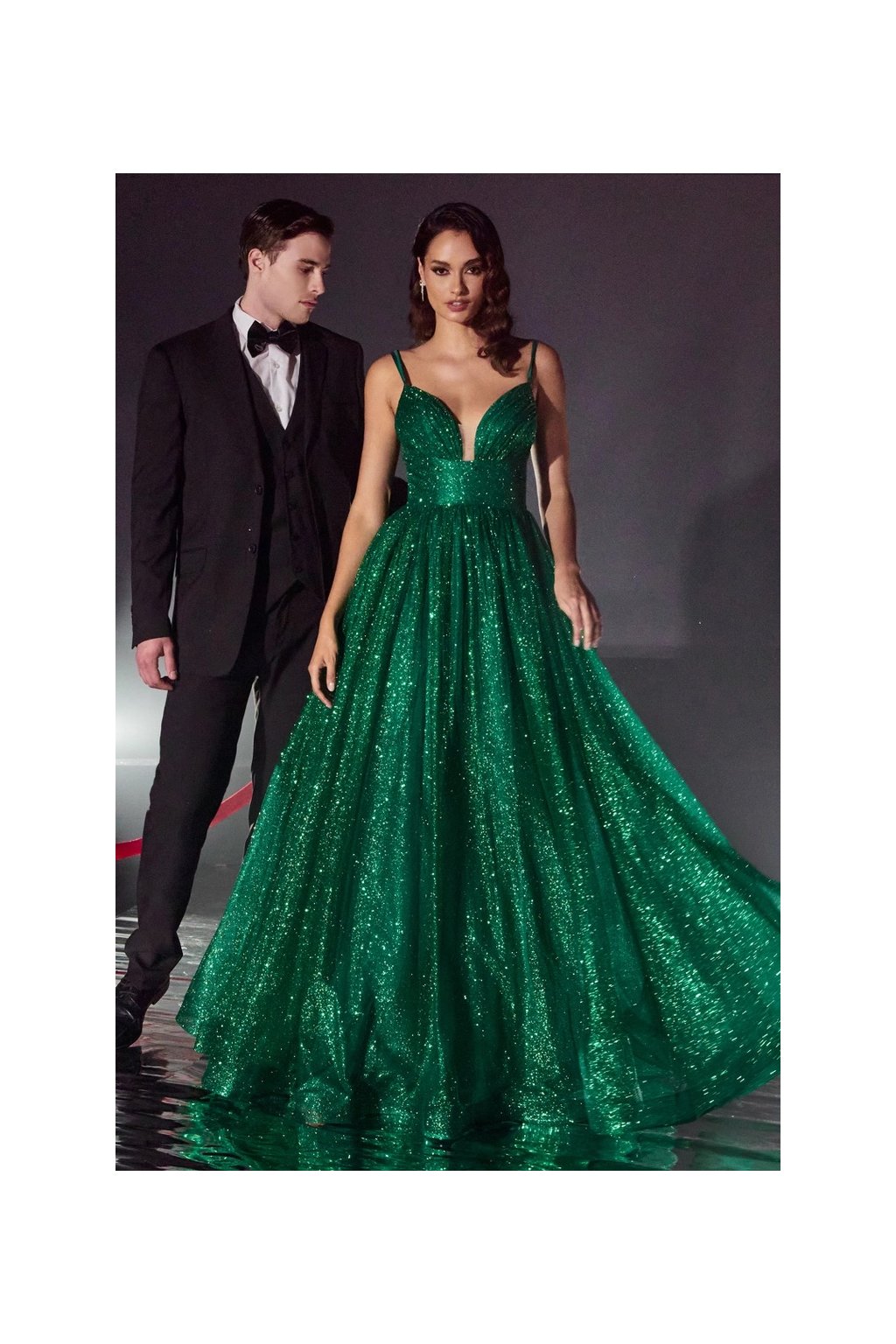 Tieto žiarivé zelené šaty vytvárajú výrazný, luxusný vzhľad. Dokonale tvarovaný živôtik, tenké ramienka a bohato rozprestierajúca sa sukňa dodávajú modelu noblesu a očarujúci efekt pri každom pohybe.