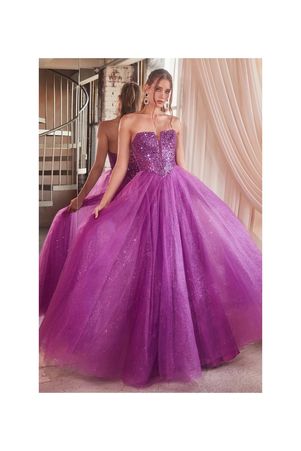 Fialové princeznovské šaty pôsobia mimoriadne pôsobivo – trblietavý živôtik krásne formuje postavu a bohatá, objemná sukňa vytvára rozprávkový efekt. Ideálna voľba pre ženu, ktorá chce zažiariť ako skutočná hviezda večera.