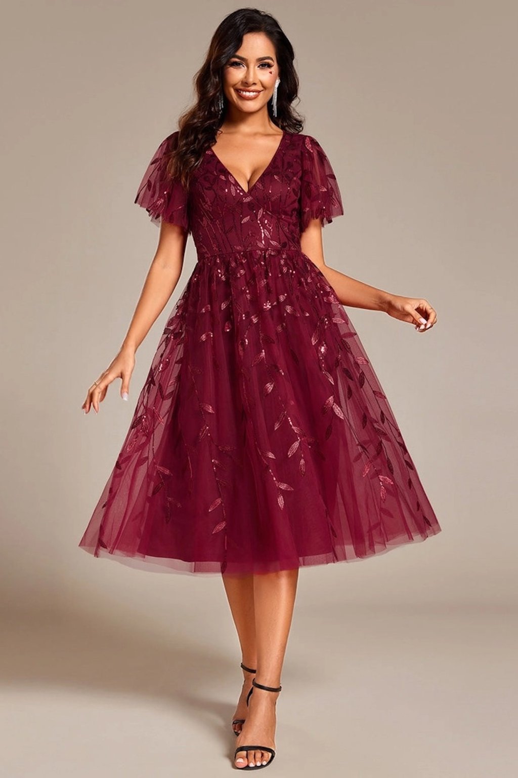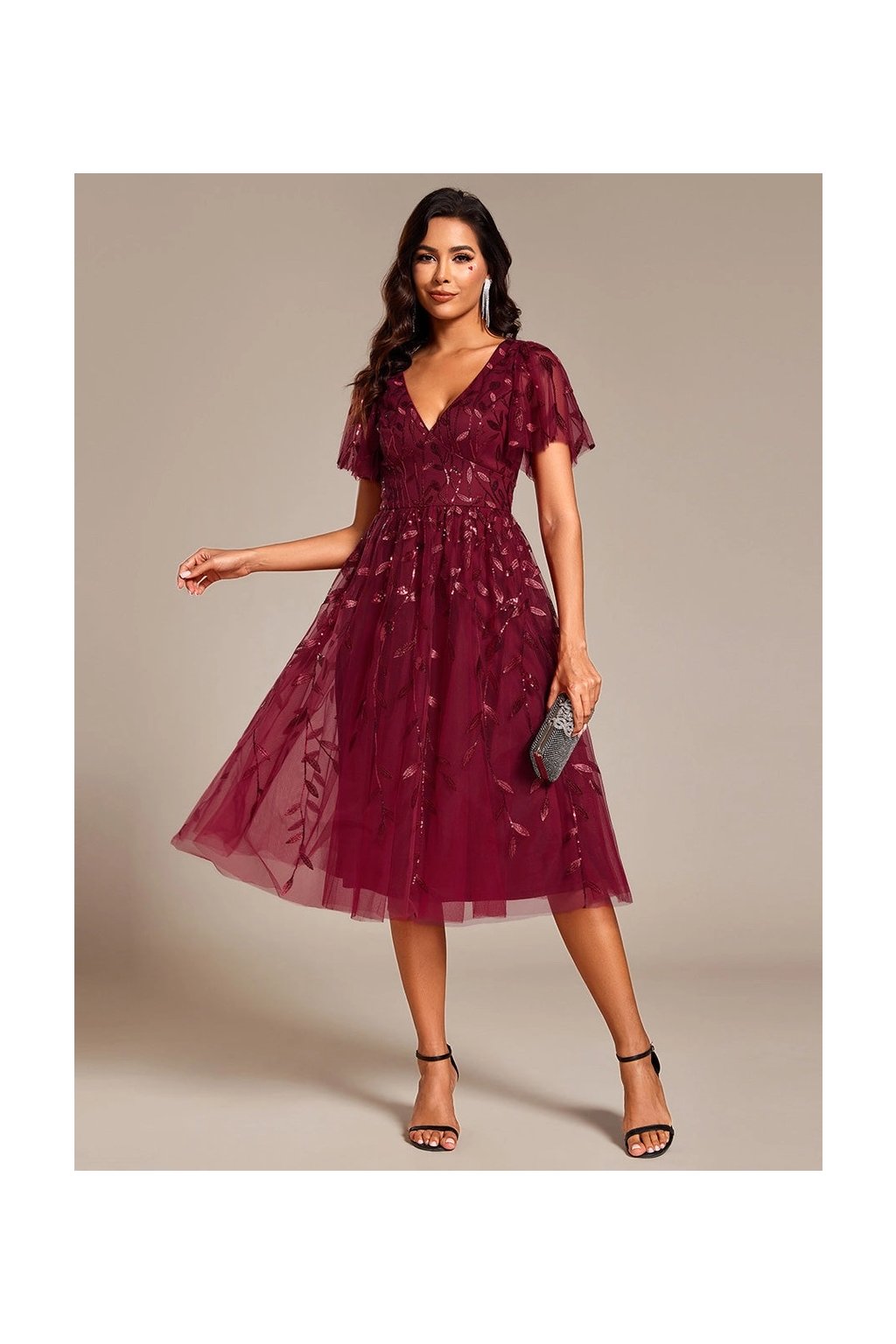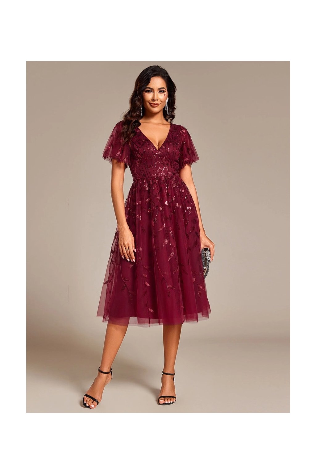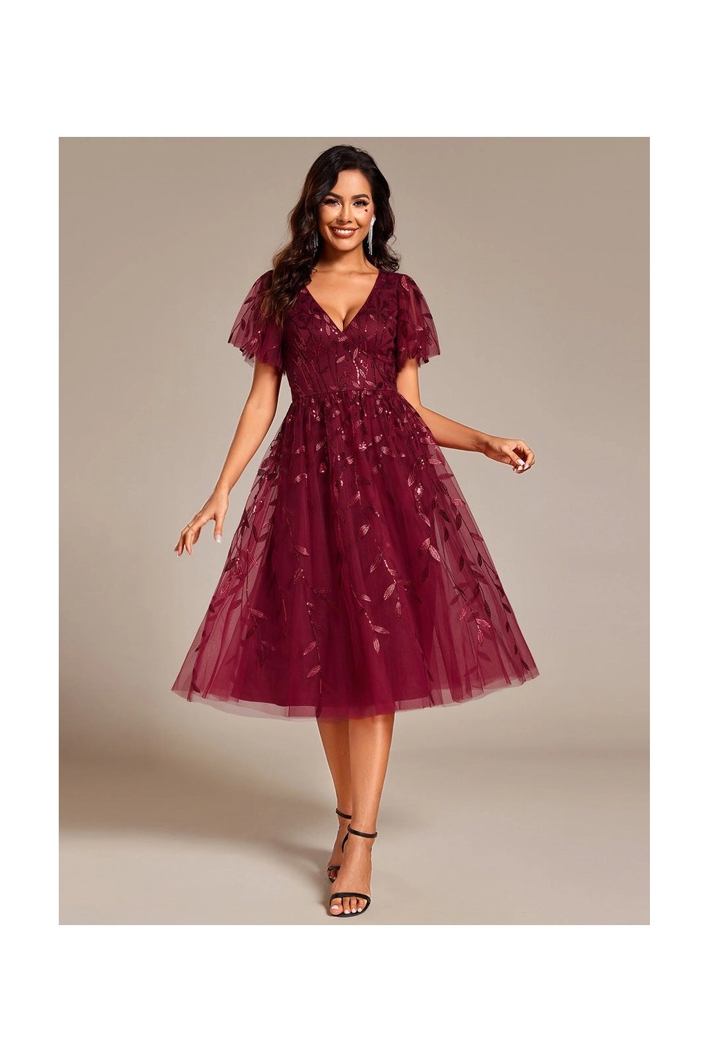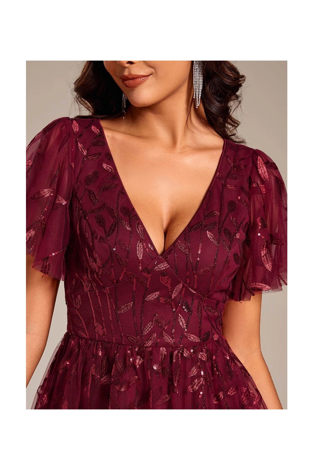 Tieto bordové spoločenské šaty pôsobia jemne a elegantne. V-výstrih, vzdušné rukávy a romantické zdobenie vytvárajú pôvabný ženský vzhľad, ktorý je ideálny na svadby, oslavy či večerné podujatia.